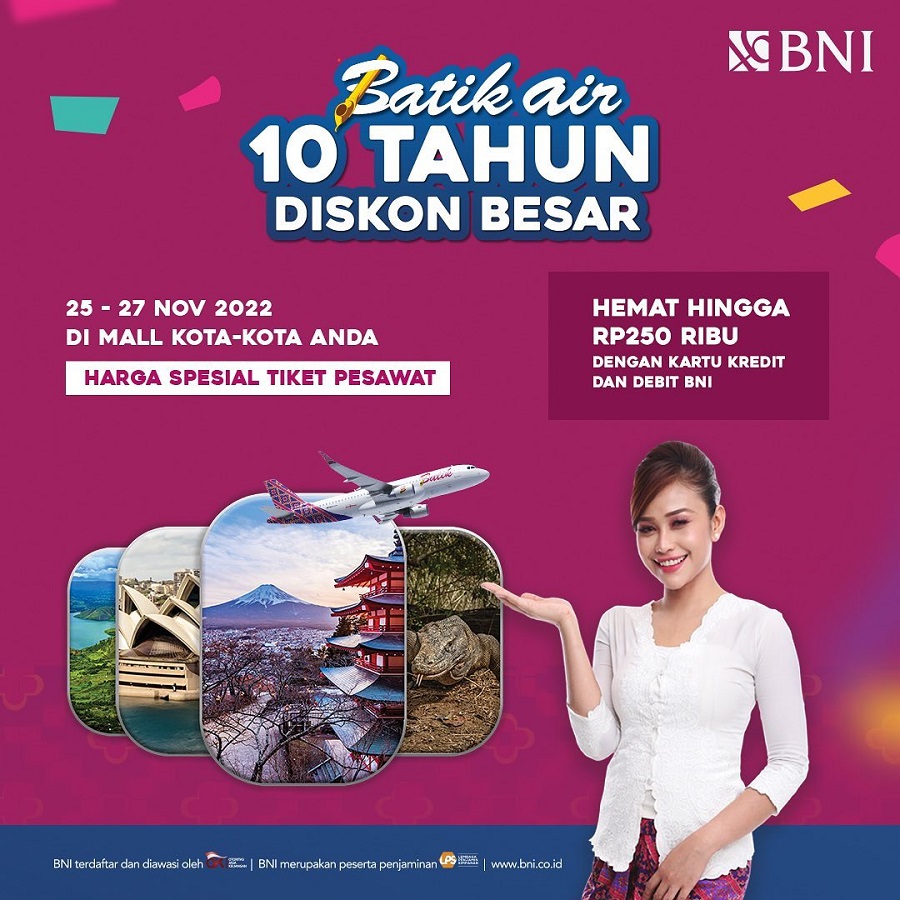 Dalam rangka memperingati “10 Tahun Batik Air” tentunya BNI selaku mitra bank akan mendukung acara tersebut melalui program promo yang BNI tawarkan meliputi welcome cashback, potongan harga/ cashback, cashback untuk top spender, hingga exclusive privilege di bandar udara.