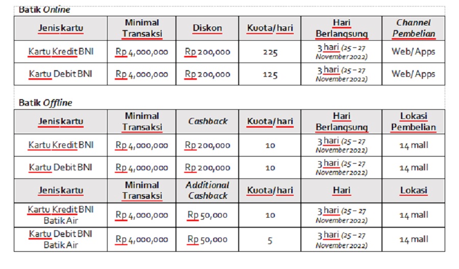 - Kuota Kartu Kredit & Debit CoBrand BNI Batik Air (offline) adalah bagian dari Kuota Kartu Kredit & Kartu Debit BNI (10 kuota/hari/lokasi, mana duluan yang transaksi).