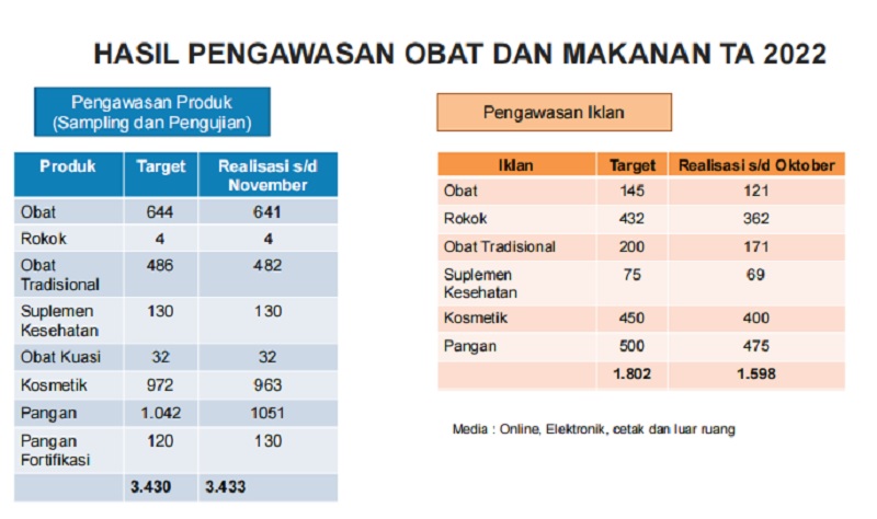 Pengujian produk obat dan makanan melalui pengawasan iklan (media elektronik, media cetak, media social dan media luar ruang). Pengawasan ini dilakukan sepanjang tahun.