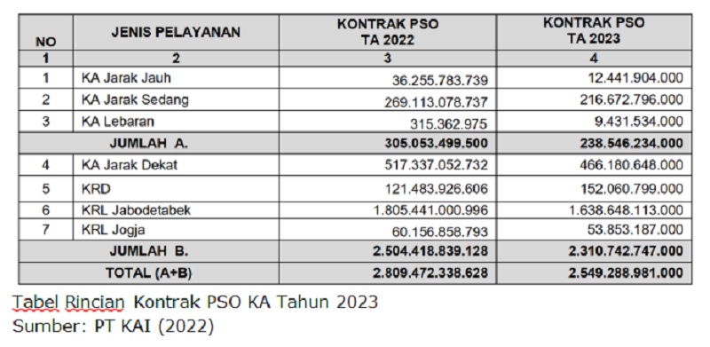 Alokasi Dana Kewajiban Pelayanan Publik (Public Service Obligatian/PSO) Tahun Anggaran 2023 diprioritaskan untuk KRL dan KA Ekonomi Jarak Dekat. Hal ini karena KA-KA itulah yang digunakan sebagian besar warga beraktifitas sehari-hari, sehingga diharapkan semakin banyak warga yang menggunakan kereta yang pada akhirnya mengurangi beban jalan raya