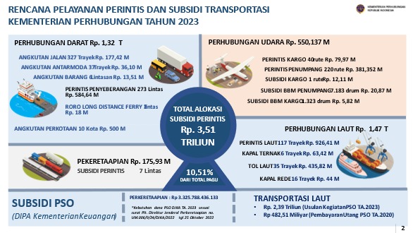 Angkutan barang untuk 6 lintasan Rp 13,51 triliun, angkutan perintis penyeberangan di 273 lintas Rp 584,64 miliar. Kapal Ro Ro long distance 2 lintas Rp 18 miliar, dan angkutan perkotaan di 10 kota sebesar Rp 500 miliar.