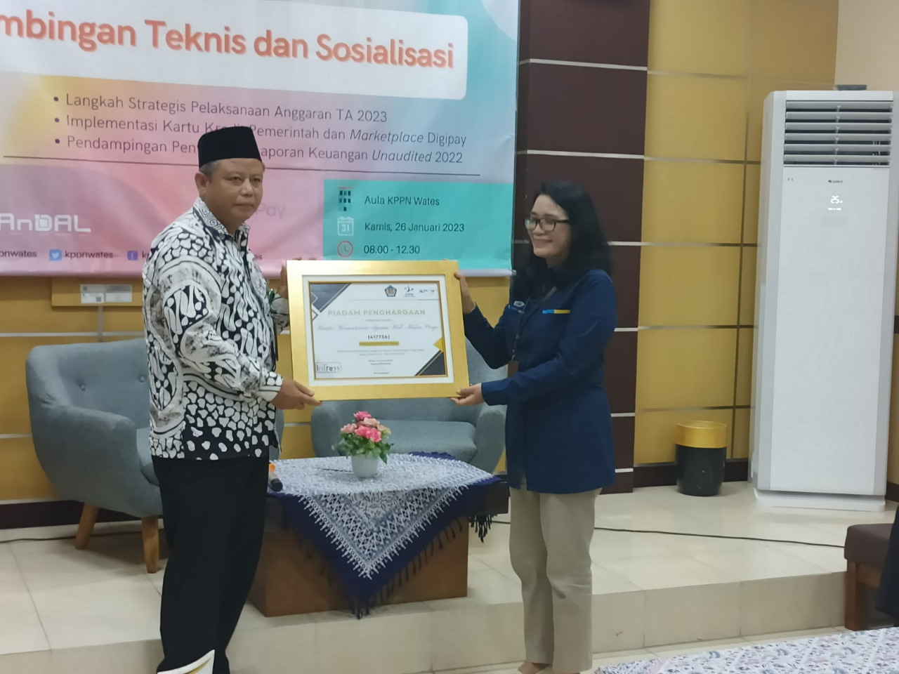 Penghargaan diterima langsung oleh Kepala Kankemenag Kulon Progo, H.M. Wahib Jamil, S.Ag. M.Pd. di Aula KPPN Wates, Kamis (26/1/2023) pagi.