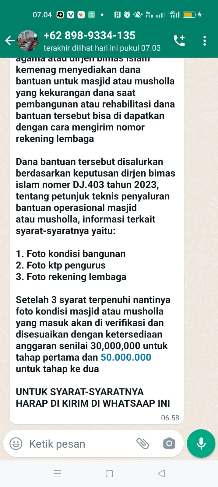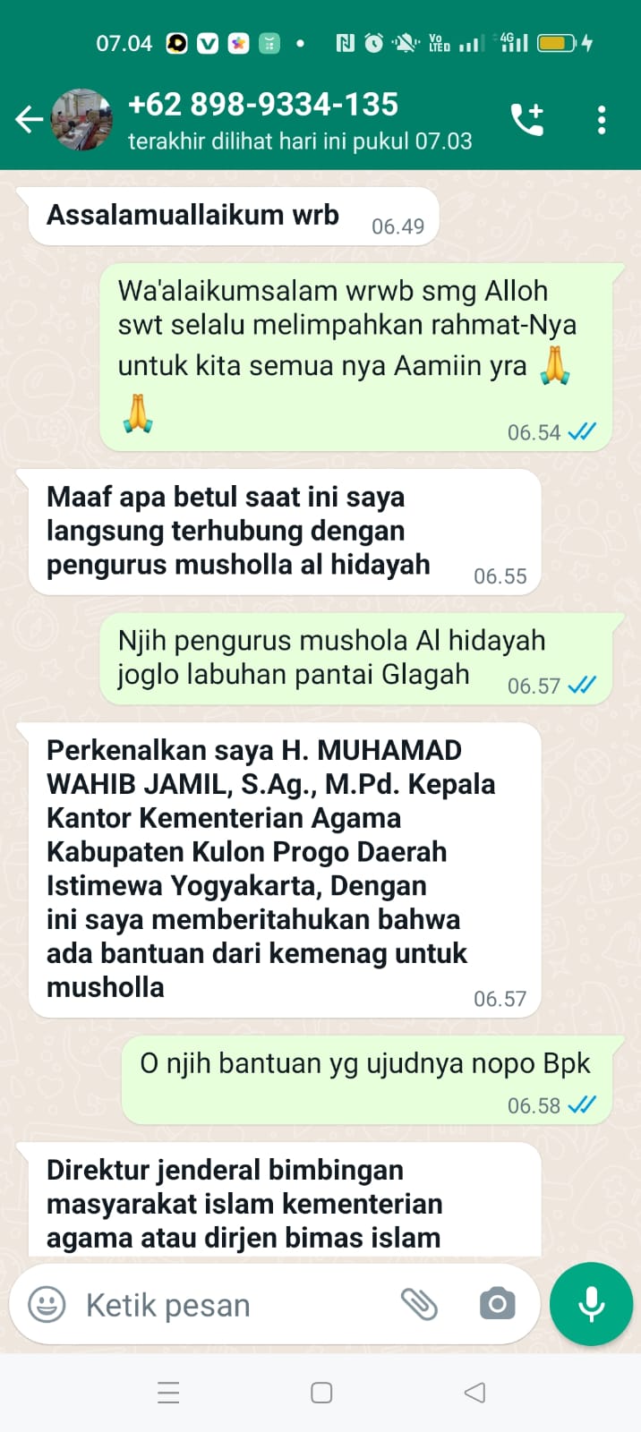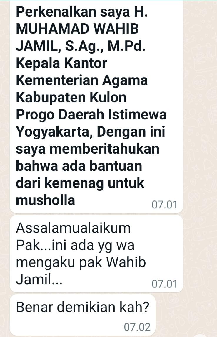 “Baru saja kami terima informasi dari masyarakat terkait informasi yang mengatasnamakan Kepala Kankemenag Kulon Progo terkait adanya bantuan dari Ditjen Bimas Islam Kemenag RI. Masyarakat yang dihubungi dijanjikan akan mendapatkan bantuan tersebut dengan mengirimkan persyaratan yang dibutuhkan kepada orang tersebut. Untuk itu sekali lagi mohon masyarakat untuk berhati-hati. Terutama untuk para pengurus dan pengelola masjid/mushala, pondok pesantren, madin, TPA, dan lain-lain,” terangnya.
