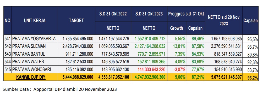 Capaian ini mengalami pertumbuhan positip sebesar 9,06% apabila dibandingkan dengan realisasi penerimaan pajak tahun 2022 pada periode yang sama. Data penerimaan pajak netto Kanwil DJP DIY per tanggal 20 Nopember 2023 sudah mencapai Rp5,075 triliun atau sudah mencapai 93,2%.