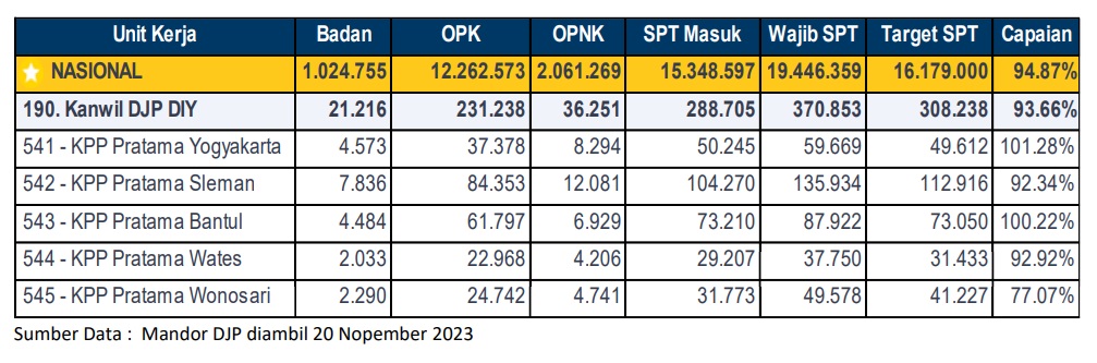 Realisasi Kepatuhan SPT sampai dengan 20 Nopember 2023 adalah 288.705 SPT dari target 308.238 SPT dengan realisasi 93,66%.