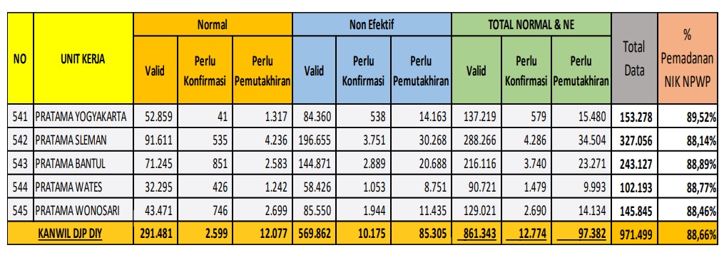Untuk mendukung Coretax inilah diperlukan pemadanan NIK-NPWP. Progres pemadanan NIK-NPWP di Kanwil DJP DIY sudah mencapai sekitar 88,66% dari total NPWP Normal dan Non Efektif.