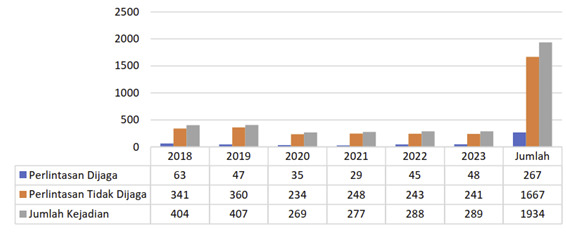 Mengutip data dari PT KAI, menyebutkan selama rentang tahun 2018 hingga 19 November 2023 ada 1.934 kejadian kecelakaan di perlintasan sebidang. Sebanyak 1.667 kejadian (86,2 persen) diantaranya terjadi di perlintasan sebidang yang tidak dijaga. Sisanya, 267 kejadian (13,8 persen) di perlintasan sebidang yang terjaga.