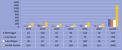 Sementara korban jiwa selama kurun waktu tahun 2018 hingga 19 November 2023, jumlah korban sebanyak 1.409 jiwa. Jumlah korban meninggal dunia 502 jiwa (35,6 persen). Jumlah korban dengan luka berat 458 jiwa (32,5 persen) dan jumlah korban luka ringan 449 jiwa (31,9 persen).