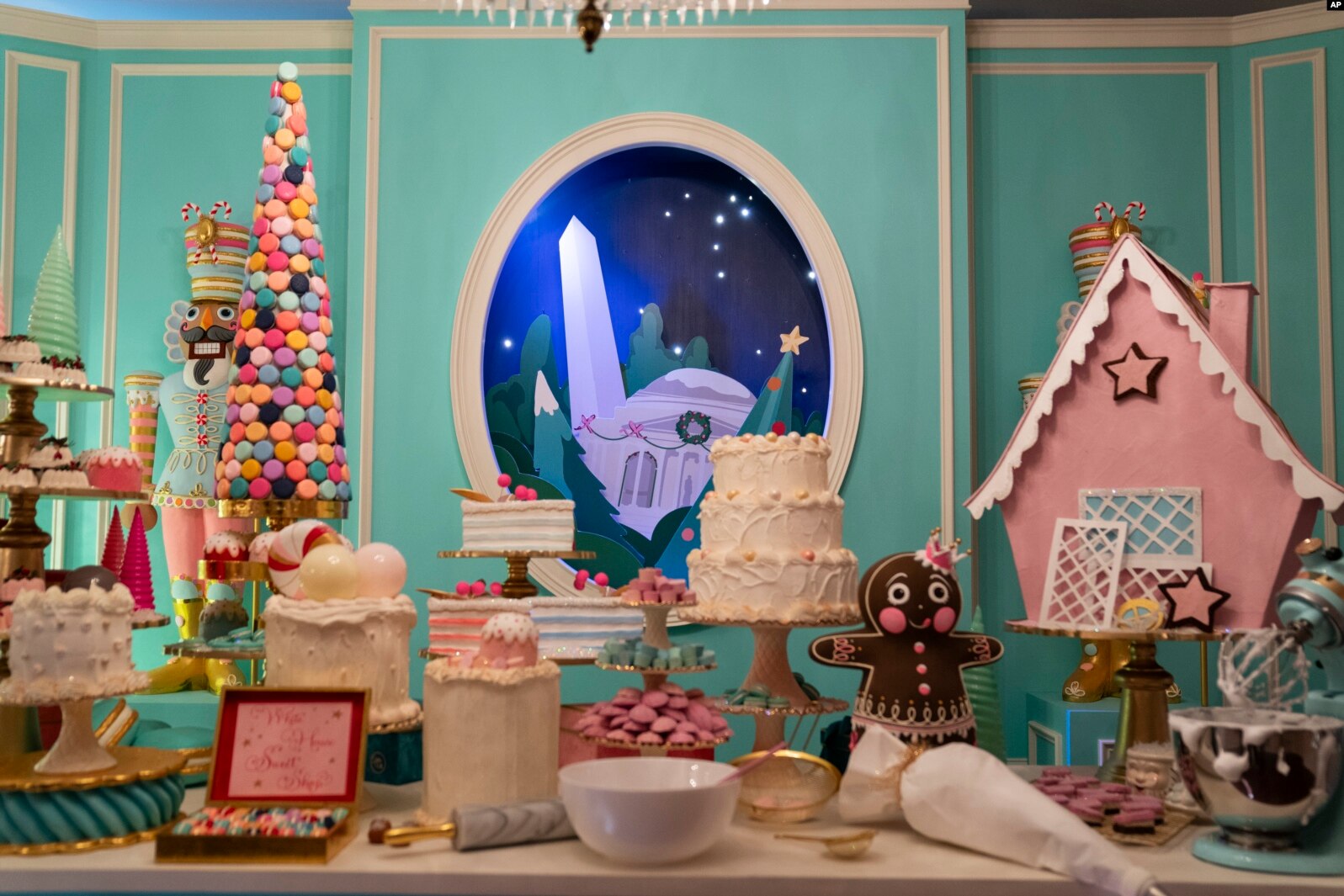 Dekorasi yang dikerjakan para sukarelawan termasuk hiasan permen liburan dan manisan lainnya yang tergantung di atas kepala, toko manisan yang penuh dengan kue dan kue liburan di China Room, dan kandang Natal di Ruang Timur, ruang terbesar di Gedung Putih. Pohon Natal resmi Gedung Putih didirikan di Ruang Biru, dengan model kereta api mengelilingi pangkalannya. Ruang Jamuan Makan Kenegaraan diubah menjadi bengkel Sinterklas.