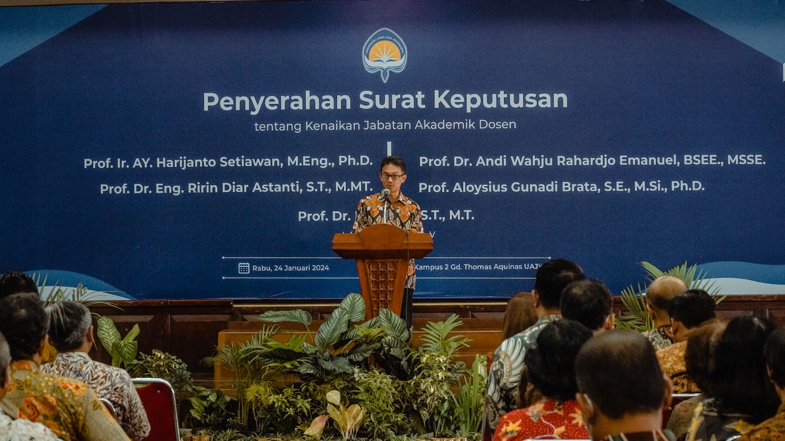 Acara ini berlangsung di Auditorium Kampus II Gd. Thomas Aquinas pada Rabu (24/1/24/2024). Hadir dalam kesempatan ini, Dr. G. Sri Nurhartanto, S.H., LL.M selaku Rektor UAJY beserta jajarannya, pengurus Yayasan Slamet Rijadi, dan Prof. drh. Aris Junaidi, Ph.D. selaku Kepala LLDikti Wilayah V beserta jajarannya.
