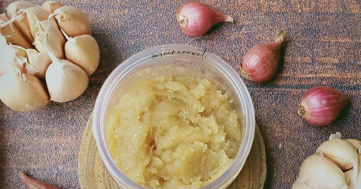 Bumbu dasar bawang juga bisa dijadikan stok selama puasa. Bumbu ini yang paling simpel dibuat, bahannya terdiri atas bawang merah, bawang putih, dan minyak goreng.