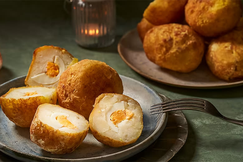 - Olesi tangan dengan sedikit minyak. Ambil adonan kentang dan masukkan telur di tengahnya. Tutup telur dengan adonan kentang hingga sempurna.