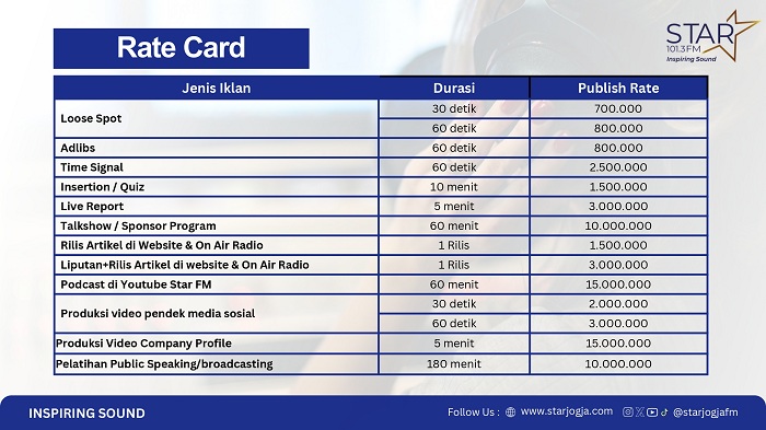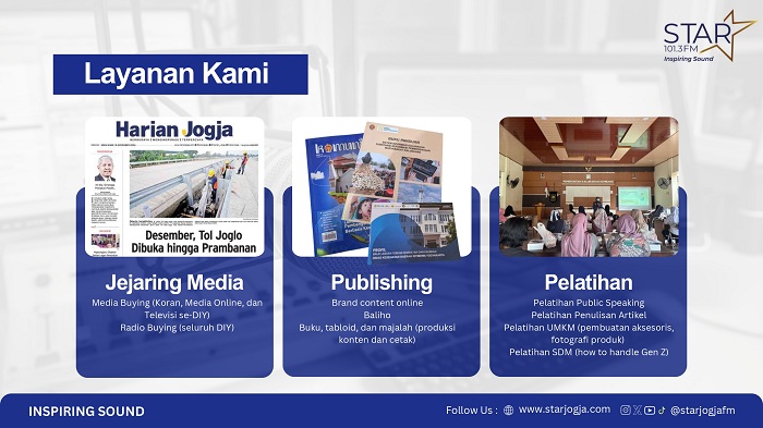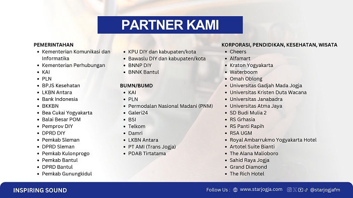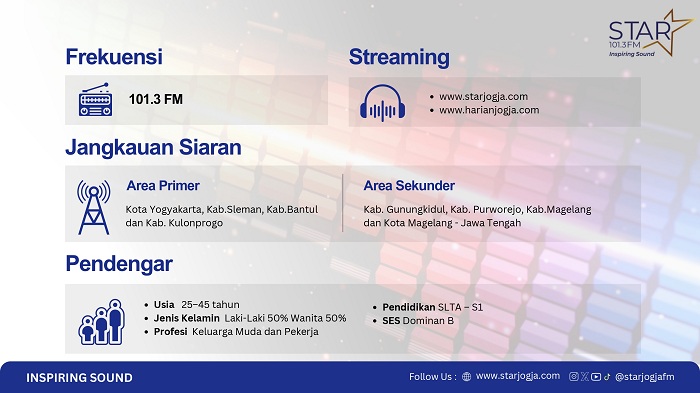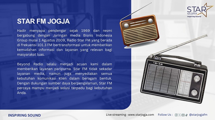 Dengan menghadirkan musik bagus, informasi terkini dan juga content inspiratif Star FM bisa didengarkan melalui 101.3 FM maupun bisa diakses siaran audio dan videonya lewat web di StarJogja.com.